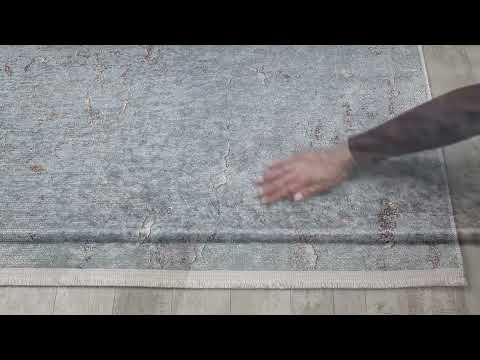A close-up of the Earthy Sands - Washable Rug - JR1819 shows its textured light blue surface with brown and gray accents, evoking a distressed look ideal for high-traffic areas.