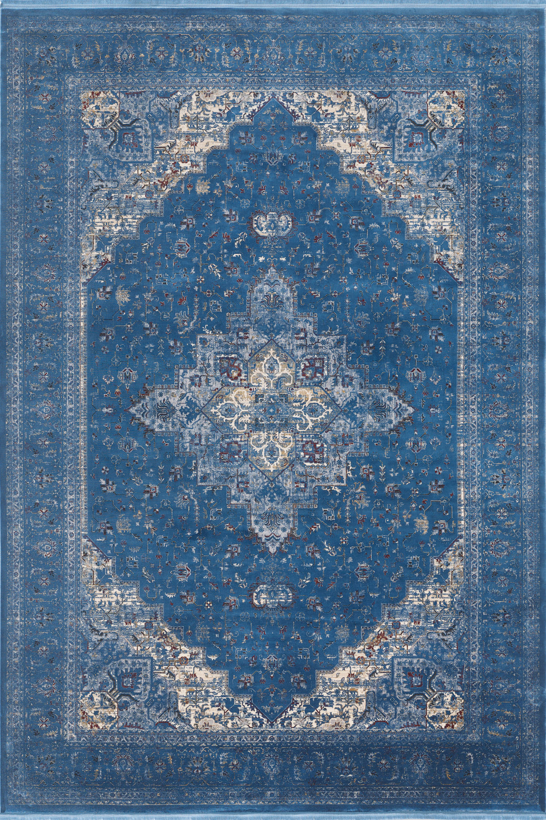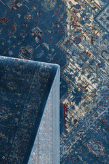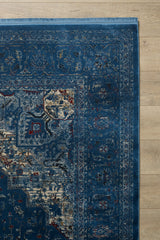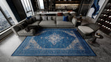 This exquisite rug is a masterpiece of design, showcasing a majestic central medallion pattern surrounded by an intricate array of floral and geometric motifs, all set against a luxurious deep blue field. The border is equally detailed, providing a perfect frame that enhances the rug's grandeur. The use of varied hues within the design elements gives this piece a vibrant yet balanced aesthetic, capable of anchoring any room with its distinguished presence and timeless appeal.