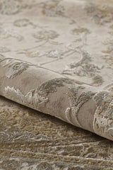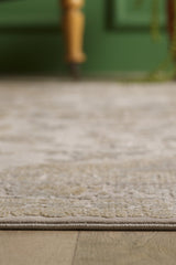 Adorning the floor with the grandeur of a bygone era, this rug presents a lavish centerpiece medallion, bordered by intricate floral motifs and a contrasting guard border. As light dances across its surface, the rug's silvery sheen and delicate cream accents invite a closer look.