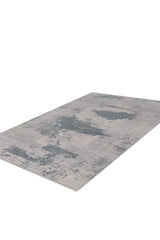 The rug features a modern, distressed design with a blend of soothing tones and dynamic visual texture. Its artful pattern consists of abstract, paintbrush-like strokes in varying shades of grey against a muted grey background, giving it a serene yet contemporary feel. The design's intentional fading and high-low texture provide a sense of depth and sophistication.