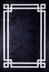 A black rug creates a dramatic and timeless foundation, perfect for sleek and modern interiors. Pair with walls in off-white or light grey to keep the space balanced and avoid overpowering the room. Floors in medium or light-toned wood, such as oak or birch, soften the boldness of the rug. Neutral furniture in taupe or beige complements the design, while metallic silver or chrome accents, such as floor lamps or decorative trays, add polish. Sheer white curtains allow natural light to brighten the room while maintaining a clean, minimalist aesthetic.