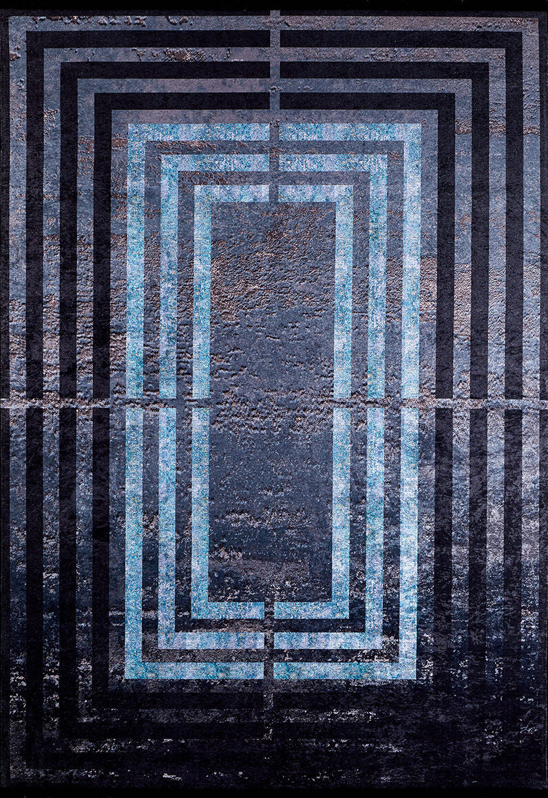 Black and blue rugs offer a sleek and sophisticated style, ideal for contemporary or industrial spaces. Pair with crisp white walls for high contrast or pale grey for a softer look. Light wood floors, such as birch or white oak, balance the darker tones while maintaining brightness. Furniture in taupe or soft grey complements the palette, while metallic silver or chrome accents, such as table lamps or decorative trays, tie the design together. Sheer curtains in light grey or pale blue complete the modern and polished aesthetic.